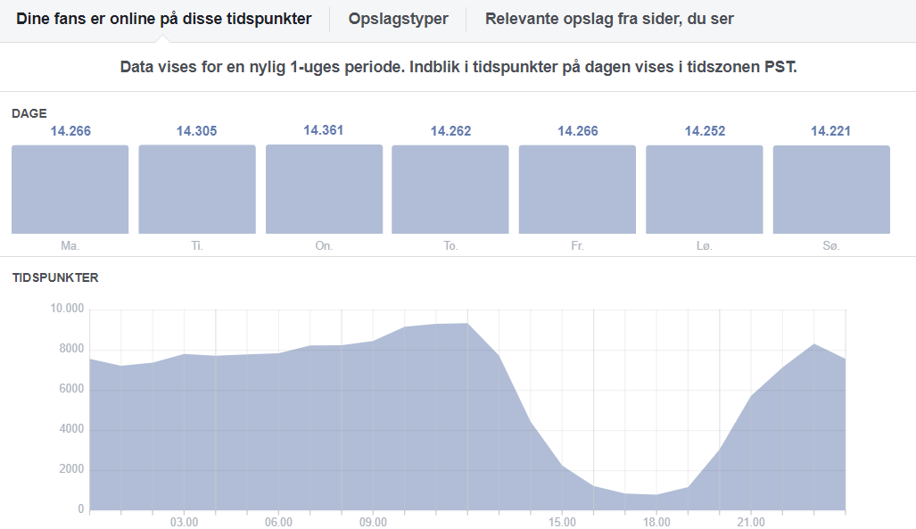 For bedst at vurdere hvornår på dagen eller ugen dit opslag giver mest værdi, skal du vide, hvornår brugerne på din Facebookside er til stede.
