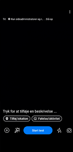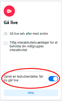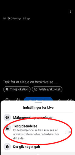 Når du laver en testudsendelse, er det ligesom at gå live. Forskellen er, at testudsendelsen kun kan ses af administratorer og redaktører af Facebooksiden du tester på.