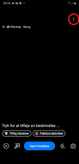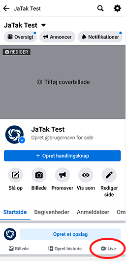 Gå ind på Facebooksiden du vil teste fra og vælg ’Live’ ved ’Opret et opslag’.